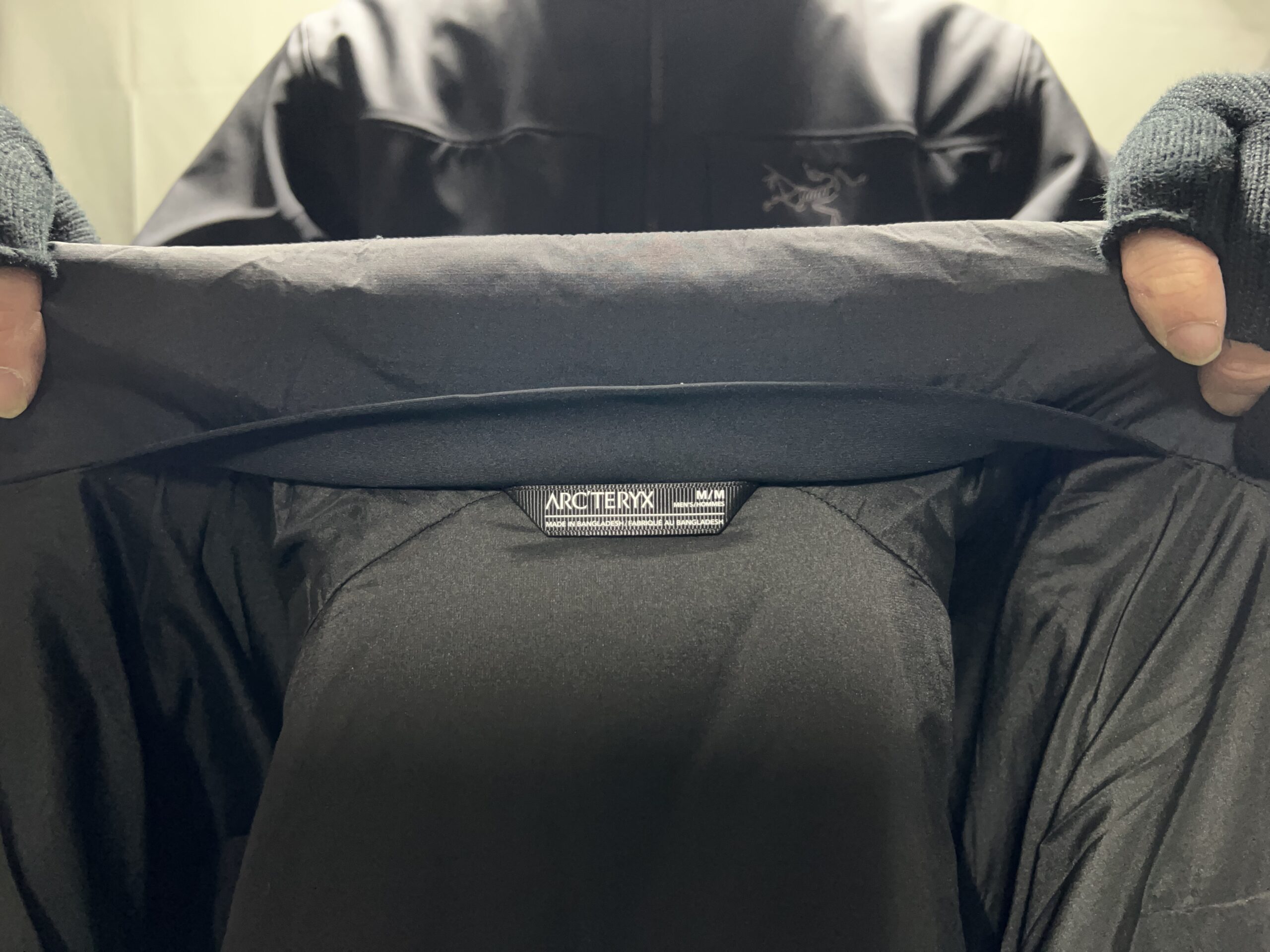 アトムSVの利点としては襟の位置が高いということがあると思います。ベータARやマカイシェルジャケットなどのドロップフードタイプで、襟高なハードシェルとの相性はばっちりだと思います。これは、保温性を考えてのことなのでしょうが、アトムLT(現アトムジャケット)の襟よりもかなり高い設定となっており、スタンドカラ―のハードシェルと組み合わせた場合、首の後ろや後頭部がハードシェルと直接接触するのを防いでくれます。特に、最近ではゴアテックス搭載生地がePEシェルにアップデートされた結果、「撥水機能」については、これまでと同等だと言われていますが、「撥油機能」に関しては、「ほぼゼロ」に等しいということなので、今後、ゴアテックスePE素材のハードシェルを購入することがあったら首の後ろ側などへの皮脂の付着を防いでくれる襟高なミッドレイヤーの存在は重要性が高まると言えそうですね。ゴアテックスePEシェルについては、「こまめに洗濯」もこれからの重要キーワードになってくることは確かだと思います。