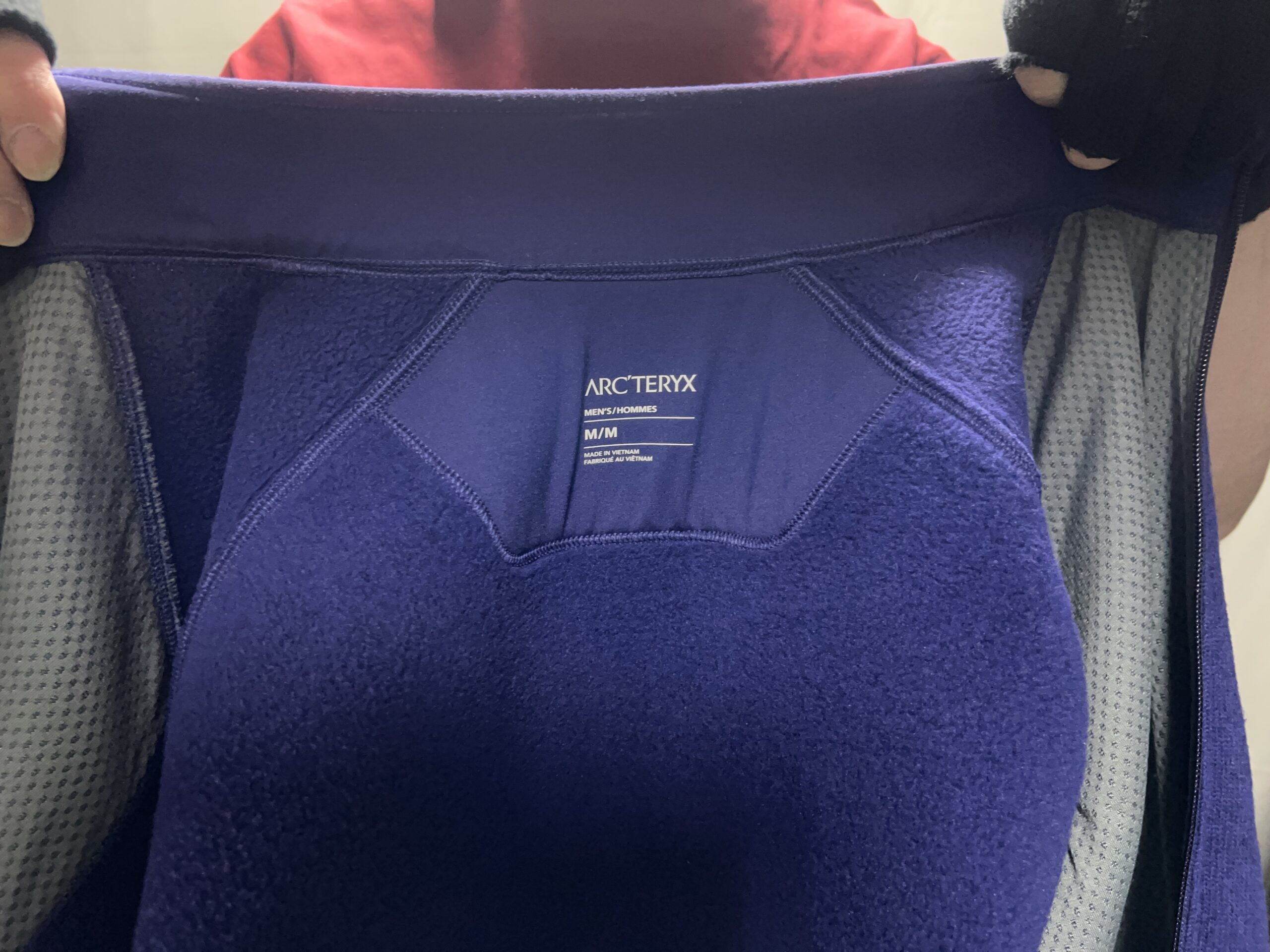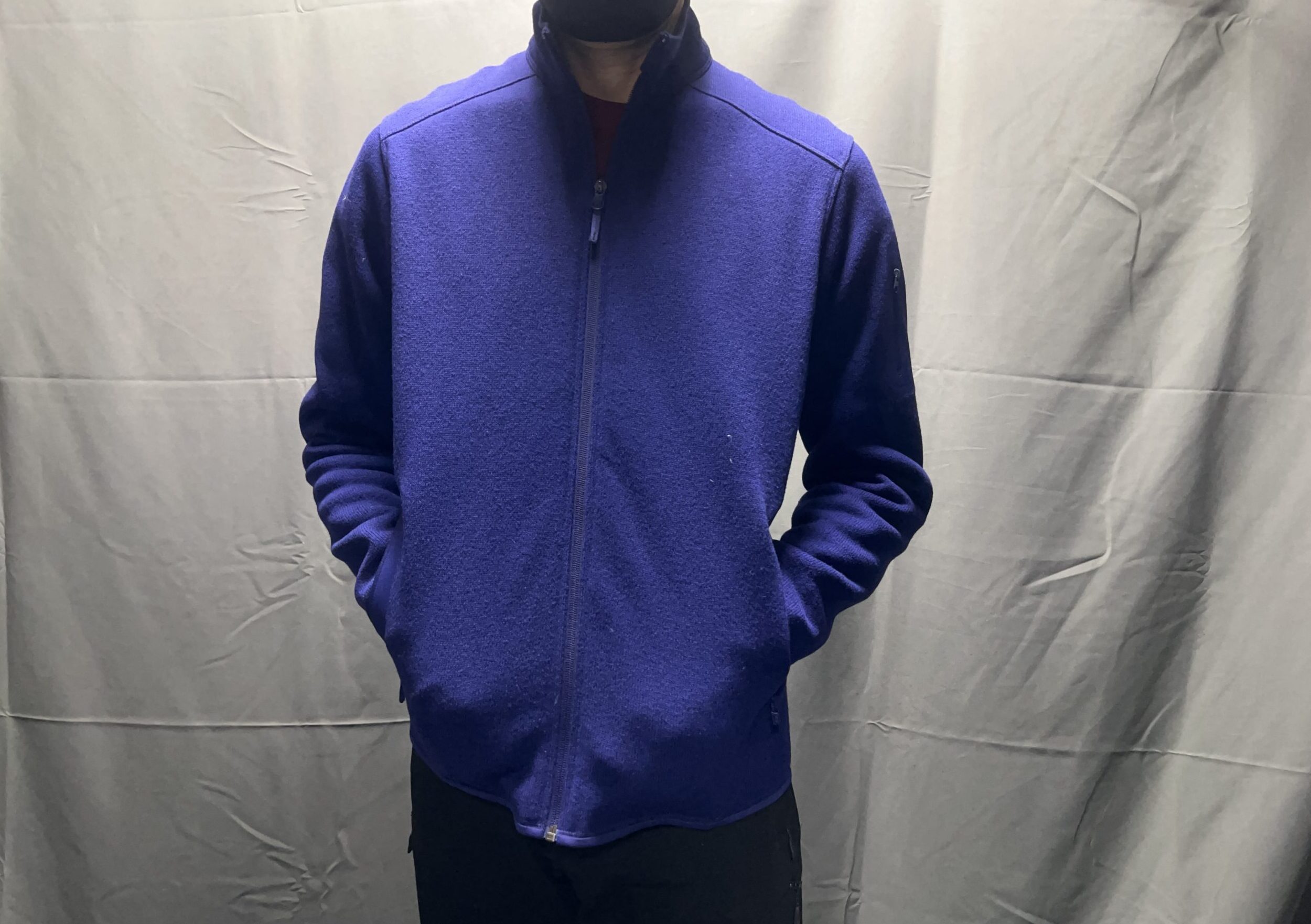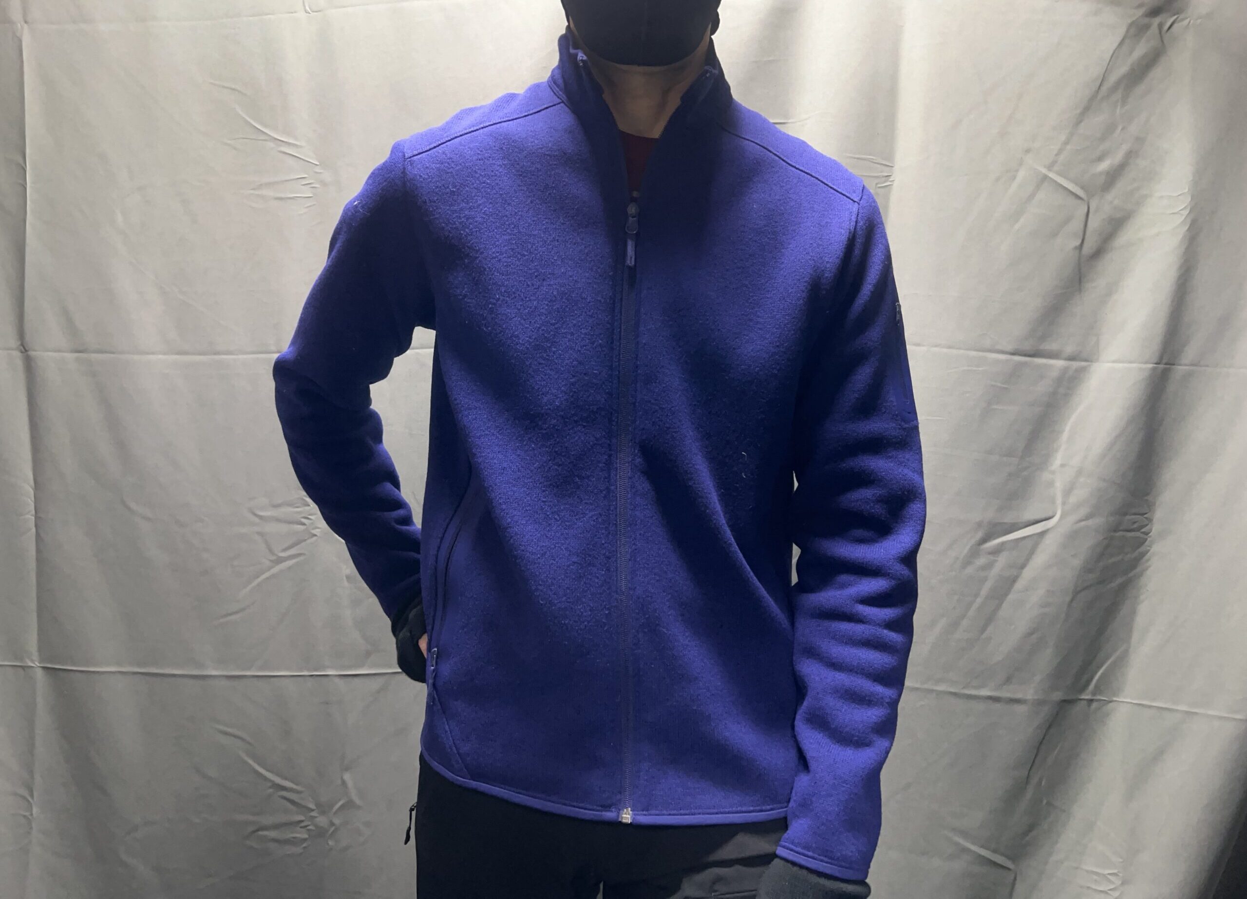 私のフィジカル・サイズは現在、身長177センチ、体重66キロ前後、胸囲92センチくらいなので、アークテリクスのハードシェルやインサレーテッドの部門ではMサイズが推奨サイズとなります。アークテリクスの公式サイトには、ユニクロと同様の、スマホで自撮りしてサイズ検討できるソフトがありますので、めっちゃ、サイズ選びの参考になります。ところがこのソフトで判定すると、アークテリクスのフリース部門は総じて「Lサイズ」推奨となるのがちょっと不思議です。でも、実店舗の店頭で試着してみるとやっぱりMサイズの方が私の身体にフィットするようだったので、最初の一着はMサイズでの購入となりました~。最初の一着目は2024年~2025年のシーズンで、青紫なSoulsonic Heatherという色を選択しました。この色のフリースを着ている人はあまりいないので、今では私の大のお気に入りです。春先や秋の季節の通勤着として、ワイシャツの上に羽織る感じでちょうどよく、とても重宝していますが、フリース素材の特質上、風がスカスカ入ってくるのは避けられないので、風が強い日や、もう少し気温が下がってくる季節になると、さすがにアウター着用はできず、ミッドレイヤー的な位置づけになります。まあ本来的なフリースの使い方としては、寒い季節には中間着的な立ち位置の方が会っているのかもしれませんが、全身黒黒コーデの多い私にとっては珍しい鮮やかな青系のジャケットなら、できればアウターとして着用したいところではあります。でも、ミッドレイヤーって見た目にワンポイントになるじゃないですか!なので全身コーデが黒黒でも中間着にちらちら見える鮮やかな青というのもコントラストが効いている感じがいいので、これはこれでアリだと思います。