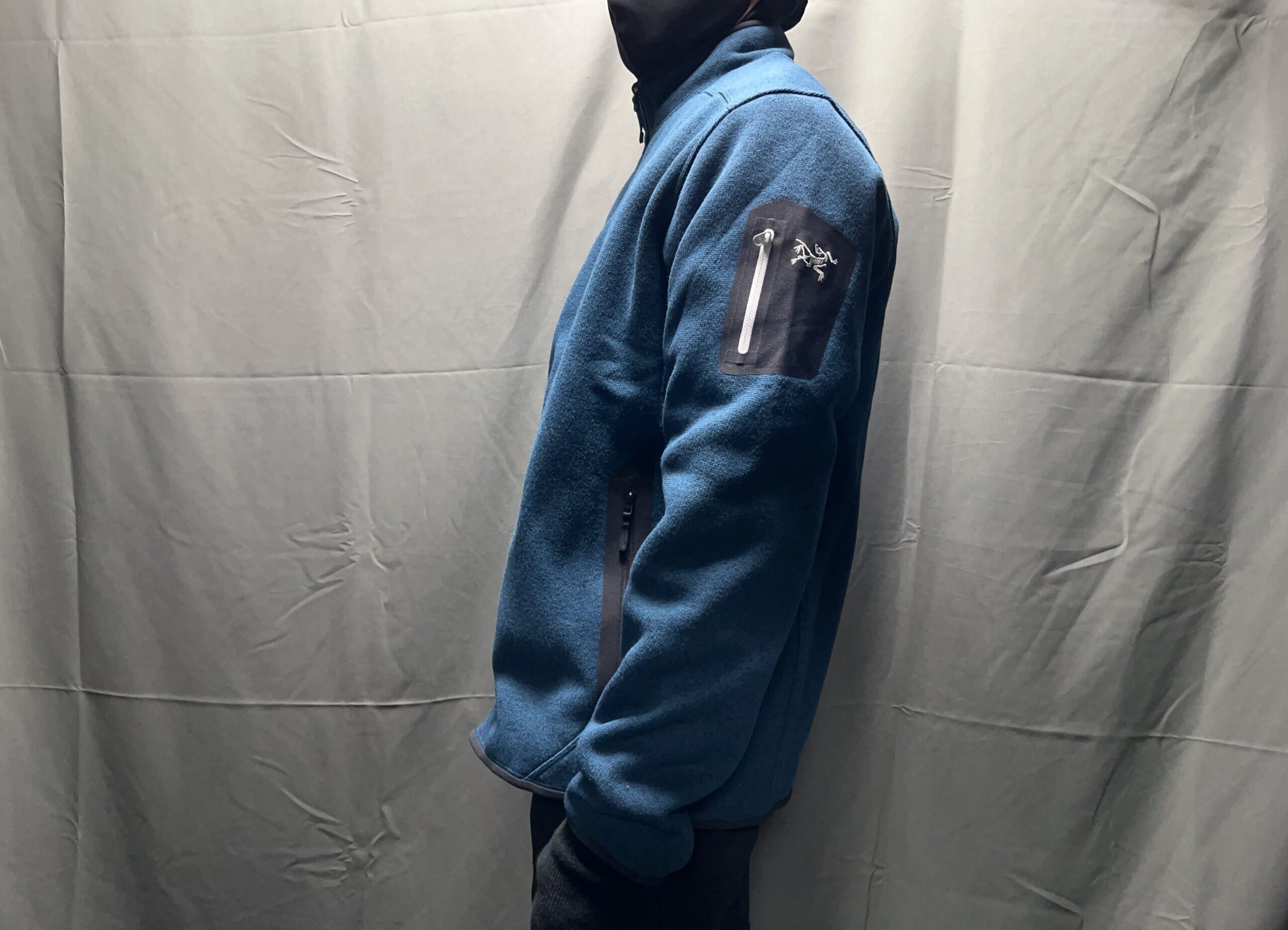 …次に、コバートカーディガンのポケットについてですが、両サイドのハンドウォーマーポケットと、左上腕部の、リフト券入れ的な大きさのポケットがついています。内ポケットはないです。コバートカーディガンは、「エブリデイシリーズ」(つまり日常使い用)なので、両サイドのハンドポケットは、よくある日常使いのジャケットにあるような馴染みのある位置(つまり下の方)についているのがうれしいですね。やっぱ、日常使いだと、サイドポケットは下の方についていた方がいいと思います。例えば、ハードシェルなどでは、リュックのハーネスとの干渉を考えて、やや上の方にサイドポケットがついていたりしますよね。私的にはハードシェルを着用する場面では、結構ごっつい手袋をしていたいするのであまりサイドポケットに手を突っ込む状況というのはなかったりしますが、日常使いのフリースということであれば、何気にポケットに手を突っ込むシーンは増えてくると思います。そういう時にスッと手を入れやすい位置ということとなると、やっぱりジャケットの下の方だと思います。