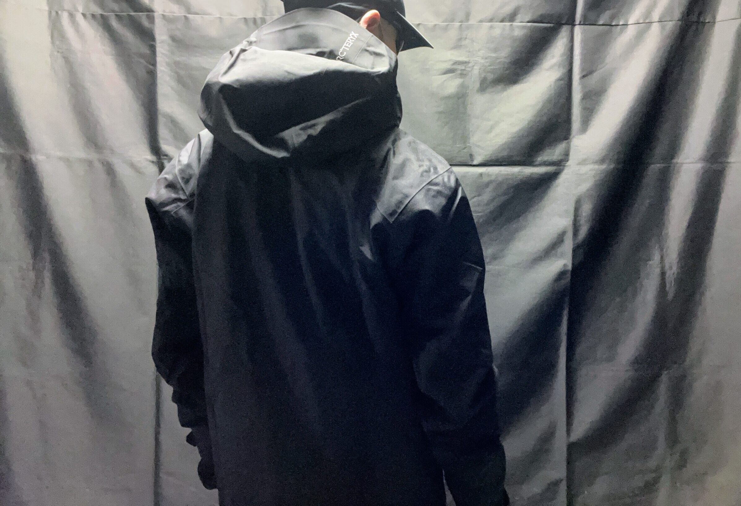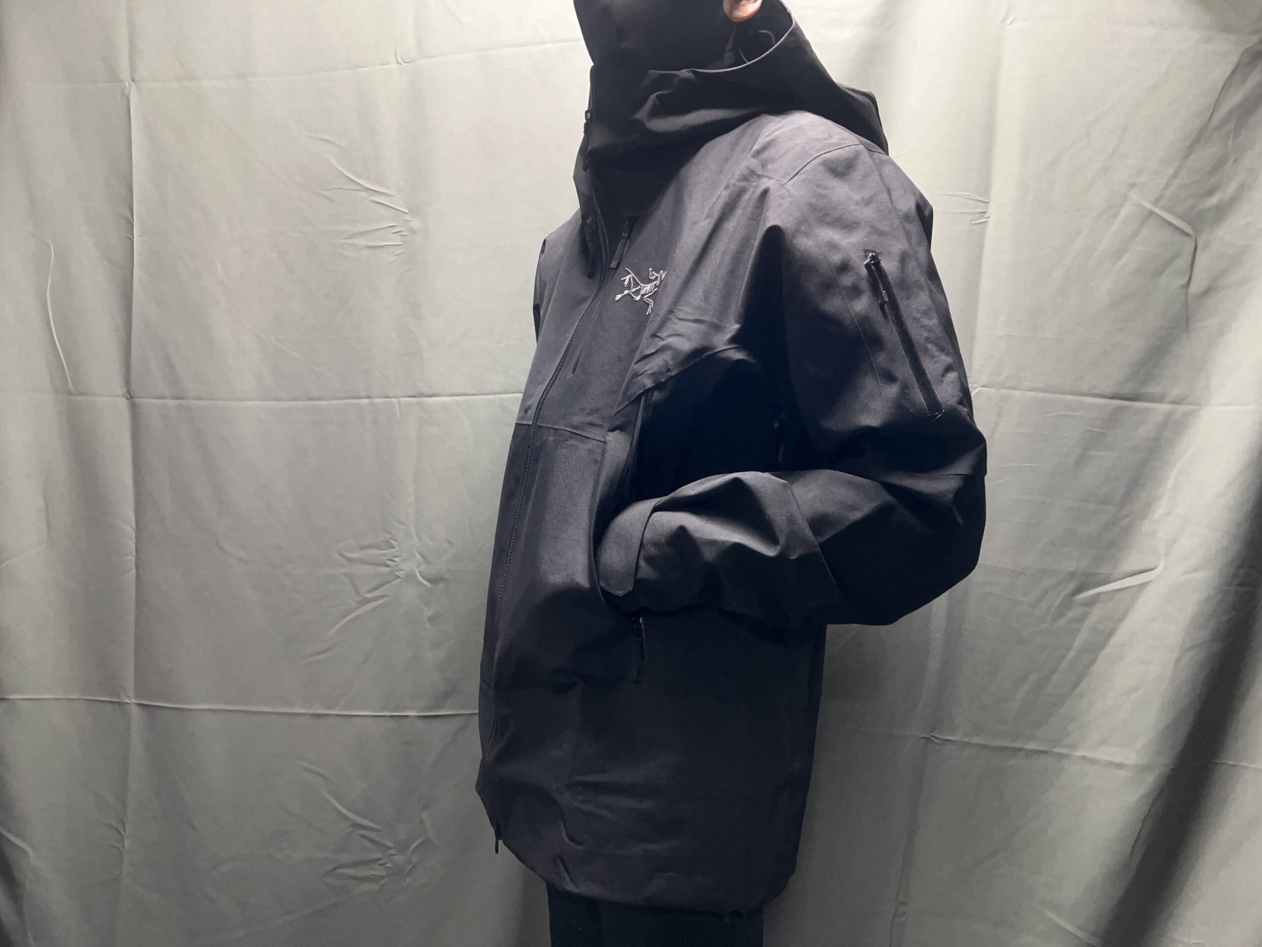 セイバーSVの特筆すべき点と言えば、ゴアテックスプロ搭載の200デニールのナイロン生地で全体が構成されている点になります。しかも公式サイトには「ATYキャンバス風リサイクルナイロン」と、なるほど、キャンバス風というか見た目に「布感」のやや強いジャケットとなっています。ラッシュジャケットやベータARジャケットはもっとツルツル・テカテカナ表面ですが、セイバーSVはもうちょっと「ザラ感」があります。